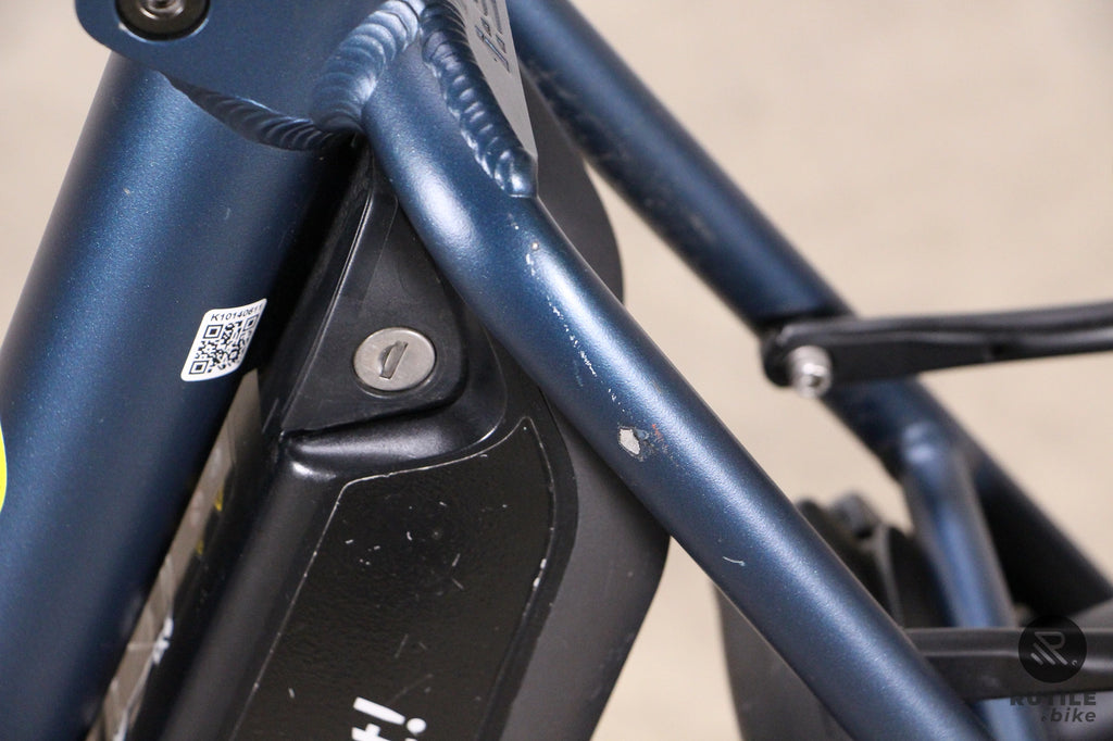 État esthétique du vélo : Très bon état. Dégâts de peinture et rayures sur le cadre, le porte-bagages, la fourche, les leviers de frein, la béquille et le guidon. Rayures sur les garde-boue, l'écran, l'unité de commande, la batterie et le carter de chaîne.